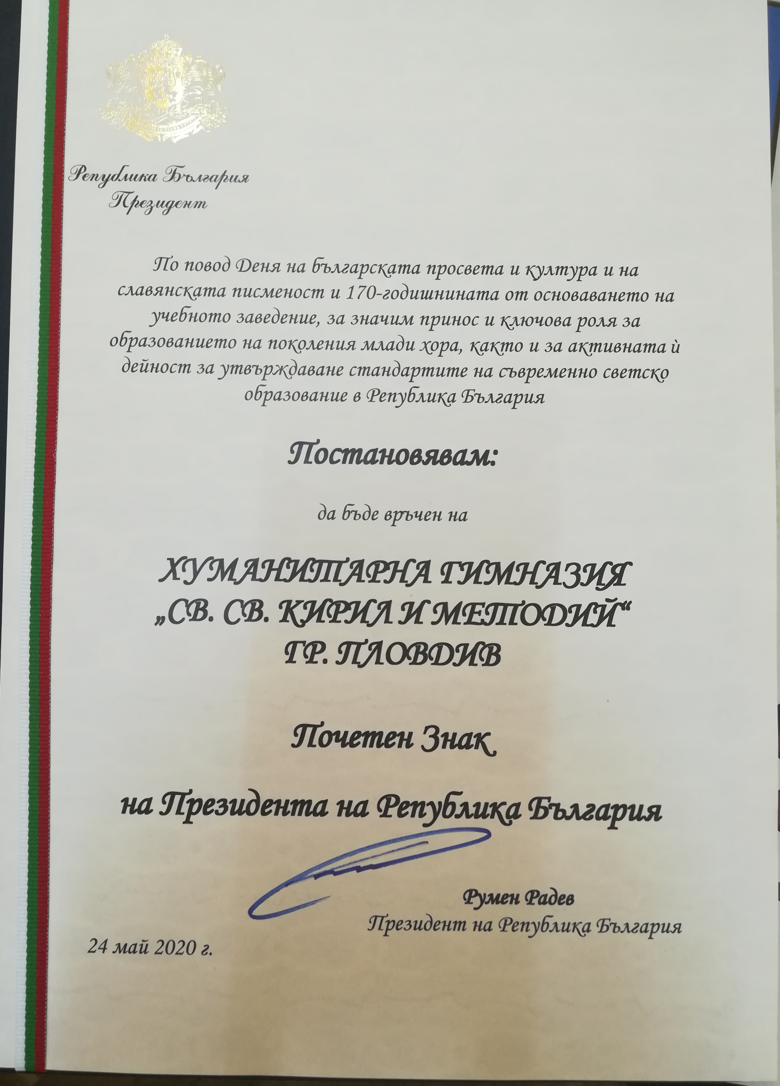 Наградата от Президента на РБългария – г-н Румен Радев е вече във витрината на Хуманитарна гимназия – Пловдив!!!